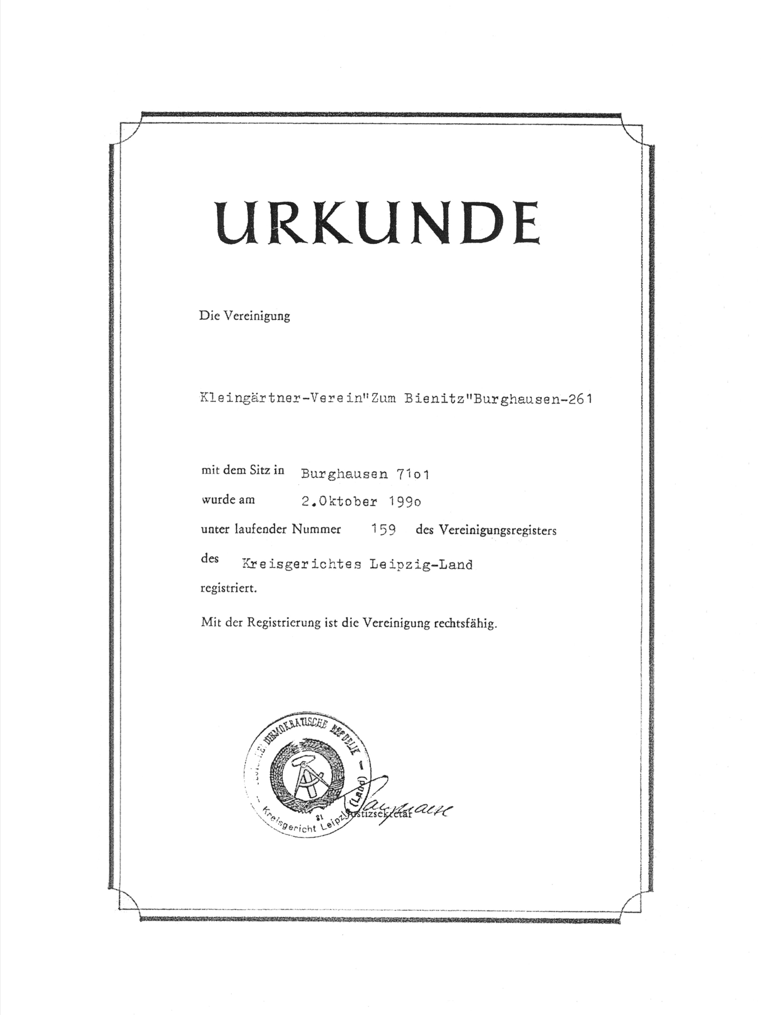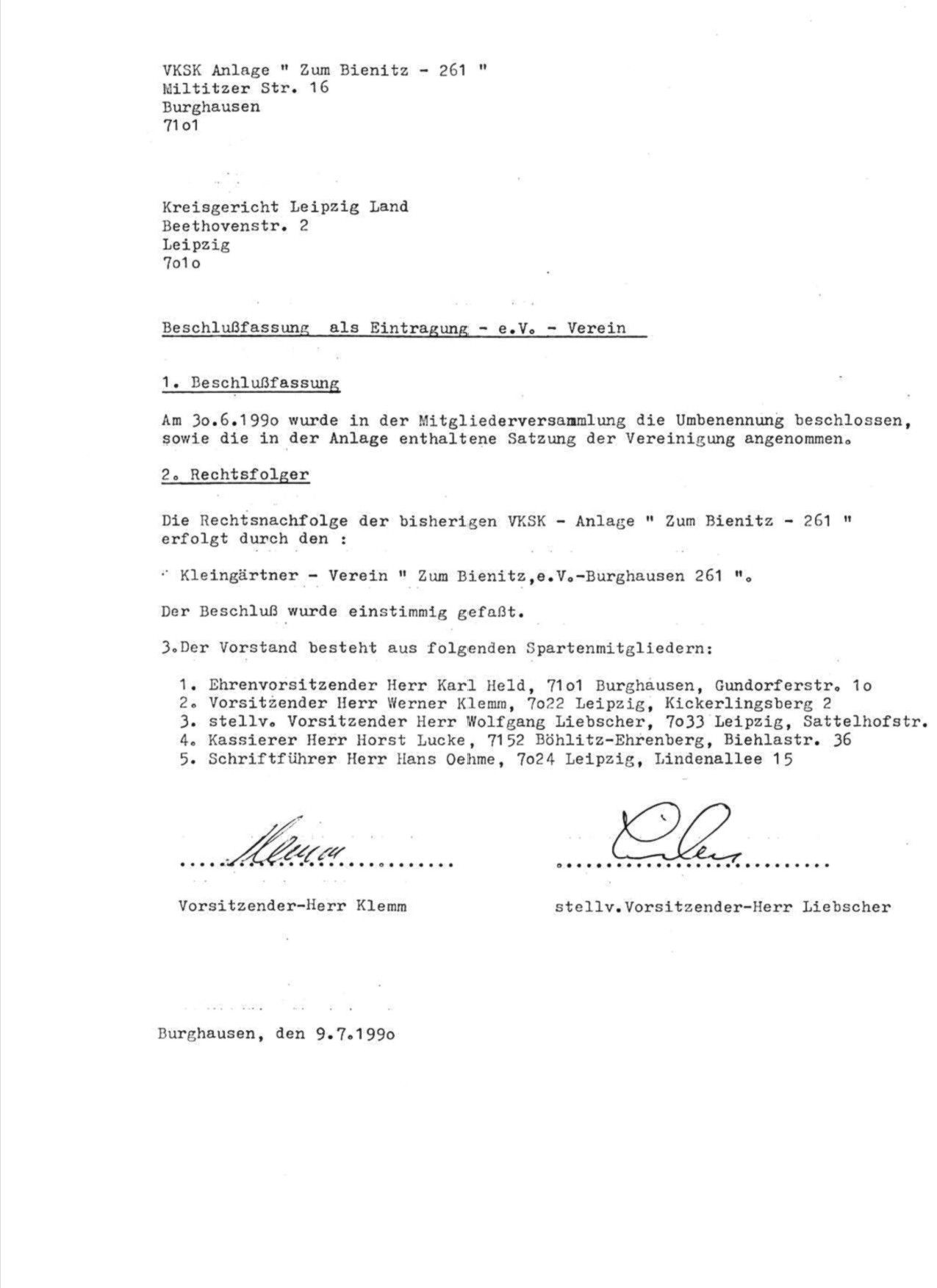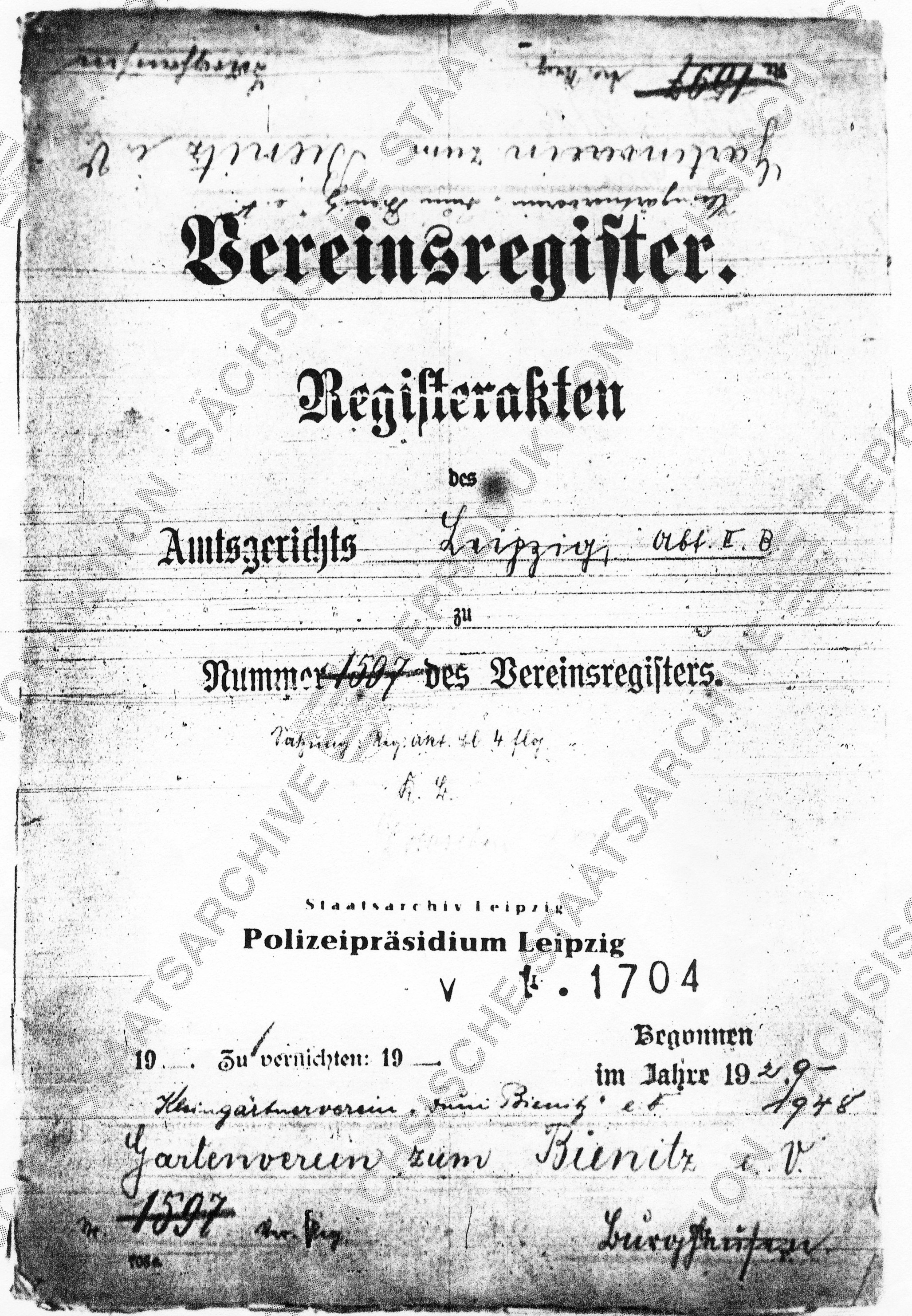 Der Verein "Zum Bienitz" ist am 2. Okto-ber 1990 unter der Registernummer 159 im Vereinsregister des Kreisgerichts Leipzig-Land registriert und 1993 vom Amtsgericht Leipzig unter der Nummer 1539 mit gleichem Namen übernommen worden.