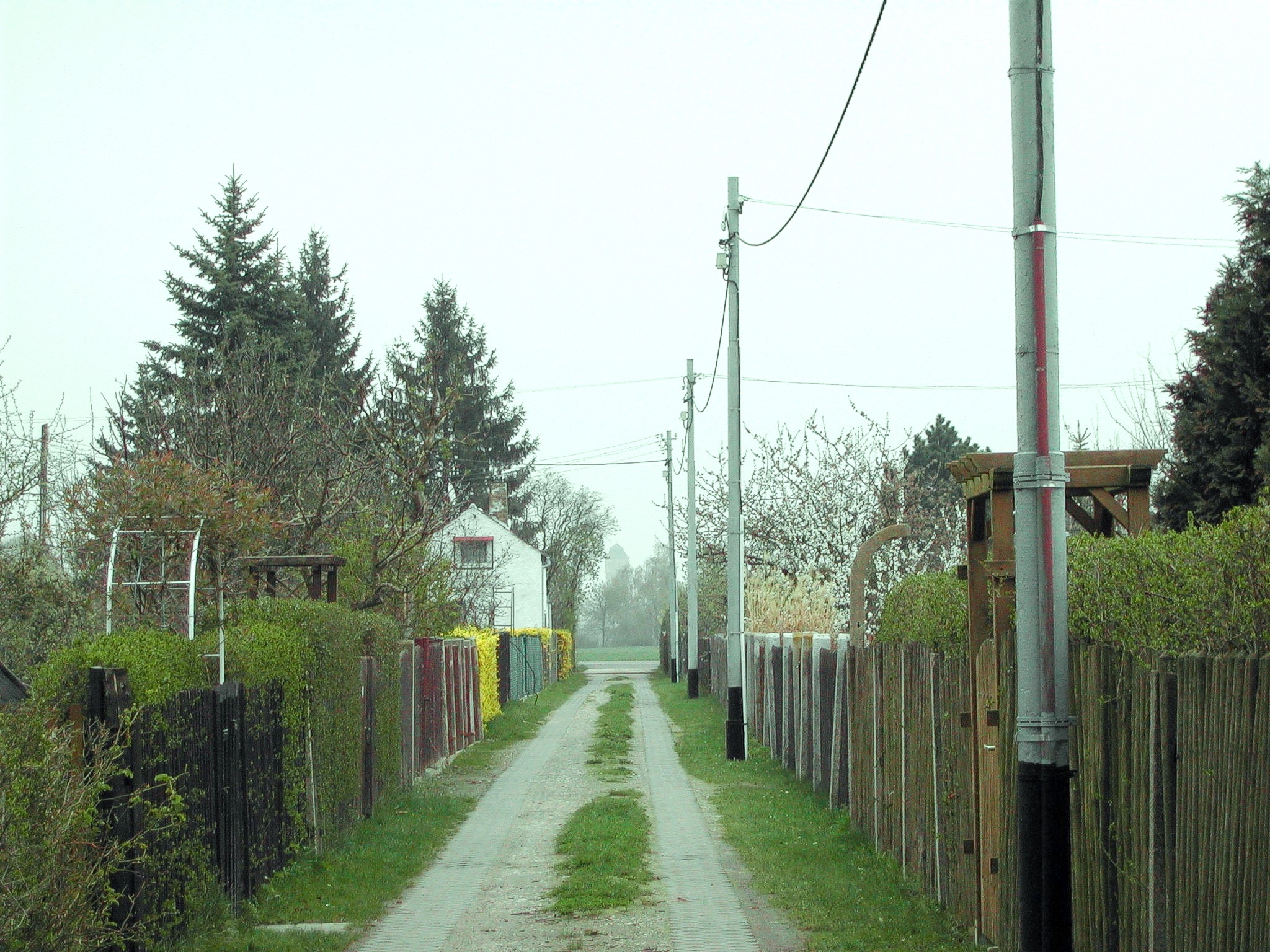 Abb. 7: Zufahrt von der Miltitzer Straße zum Parkplatz am Vereinshaus, im Hintergrund der Wasserturm von Böhlitz-Ehrenberg